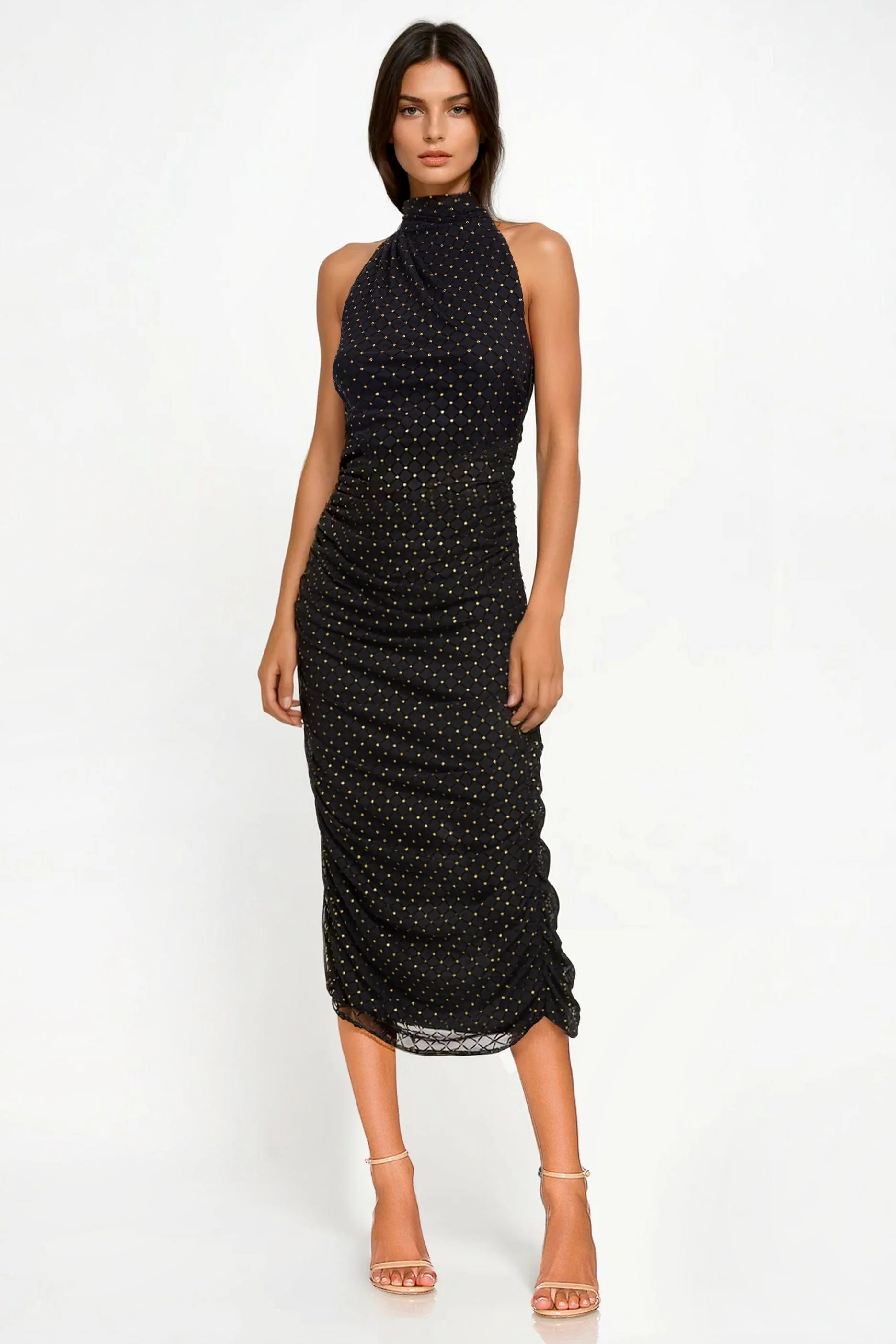 Make a statement in this effortlessly chic mesh halter pencil skirt dress. The sleek, stretch-fitted silhouette sculpts your figure, while black velvet diamonds and golden polka dots add a sophisticated touch to the classic little black dress (LBD) design. With a flattering midi length, a back slit for a hint of allure, and a ruched texture that exudes elegance, this stretch sleeveless cocktail dress is perfect for those nights when you want to look polished yet undeniably captivating. Simply zip and let the compliments start flowing.